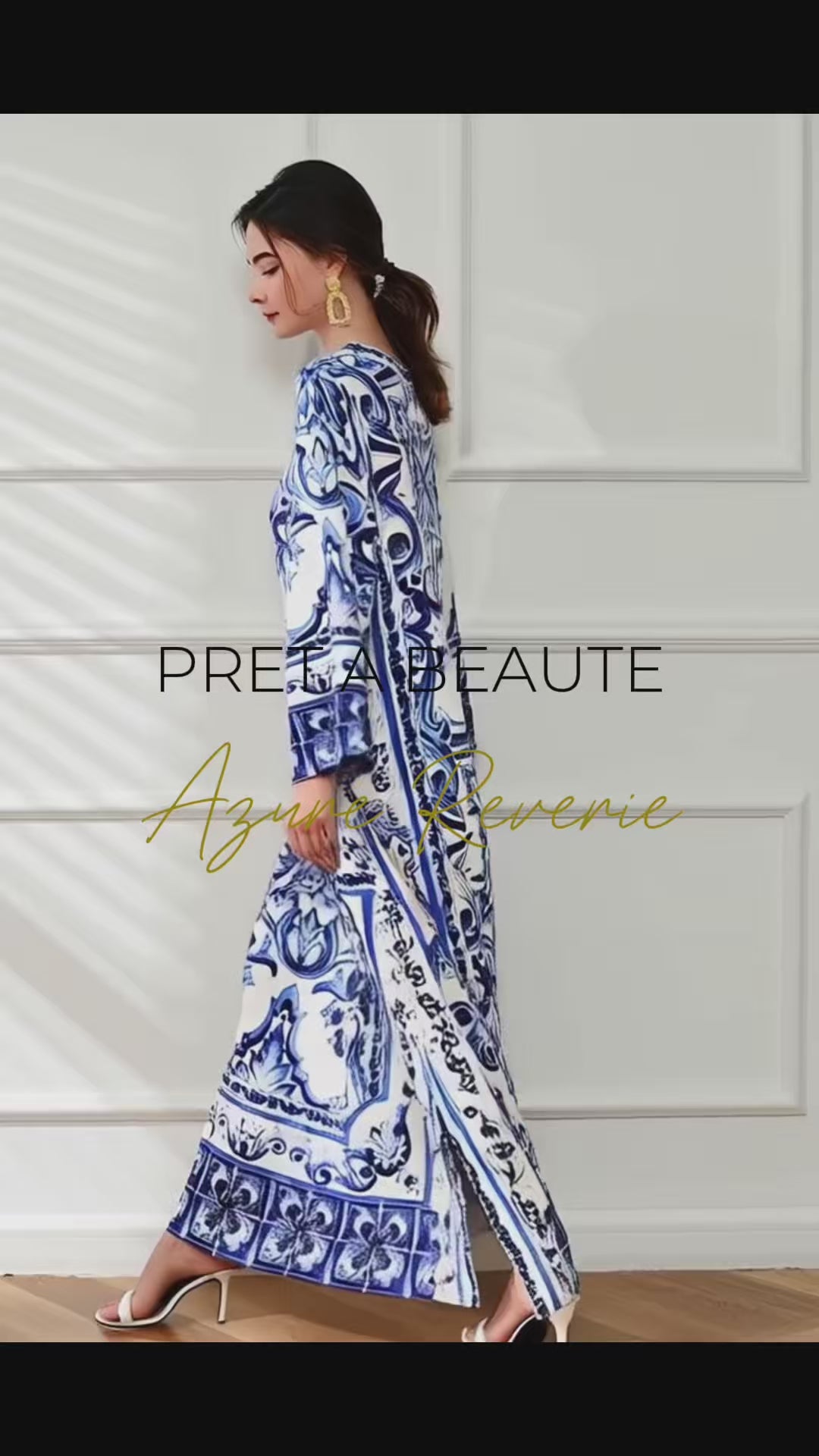 Step into a world of timeless Mediterranean elegance with the Azure Reverie Maxi Dress. Crafted from lightweight, silky polyester, this dress features a mesmerizing mosaic-inspired print in vivid shades of blue and white. The flowing maxi silhouette, relaxed long sleeves, and intricate neckline detailing evoke effortless sophistication, perfect for seaside escapes or upscale summer events. Let its vibrant energy transport you to sun-drenched shores and moonlit promenades.