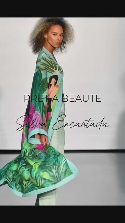 Step into an exotic dream with the Selva Encantada Kimono. Crafted from a lightweight, flowy fabric, this kimono is a wearable piece of art featuring a lush tropical print with palms, parrots, and strikingly dressed women nestled within a botanical utopia. The soft turquoise trim and sash enhance the silhouette, creating an effortlessly elegant drape whether worn open or tied. Perfect for lounging, layering, or as a standout vacation piece.