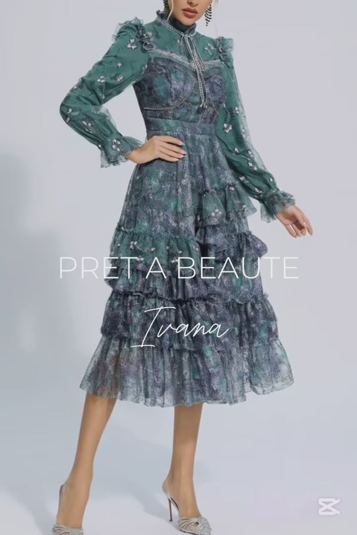 A must-have dress for any elegant occasion. Indulge in luxury with the Ivana dress, that features delicate organza tulle, and is adorned with intricate floral embroidery. The mesh design and long sleeves add elegance and sophistication, perfect for any special occasion. The unique petrol color adds a touch of exclusivity to this statement piece.
