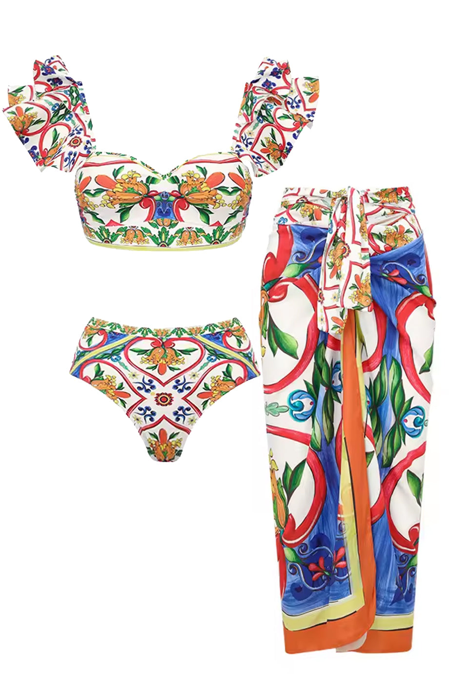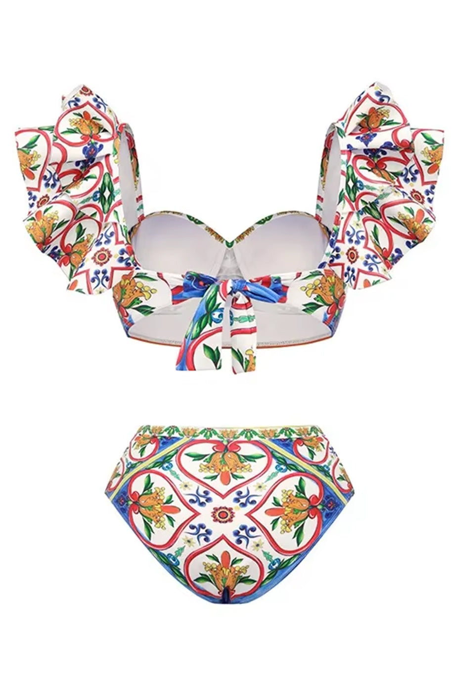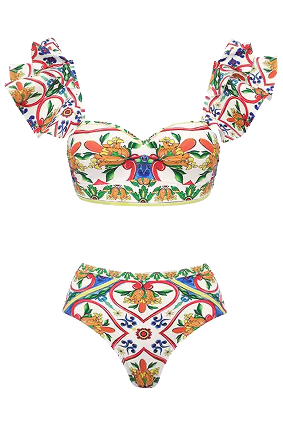 A floral statement that unites Mediterranean fantasy with the luxury of resortwear. With a colorful print top inspired by ceramic tiles, reinforced cups and impressive ruffles on the shoulders and high-waisted briefs that hug the waist, the Solaria Viva bikini swimsuit offers unforgettable appearances.