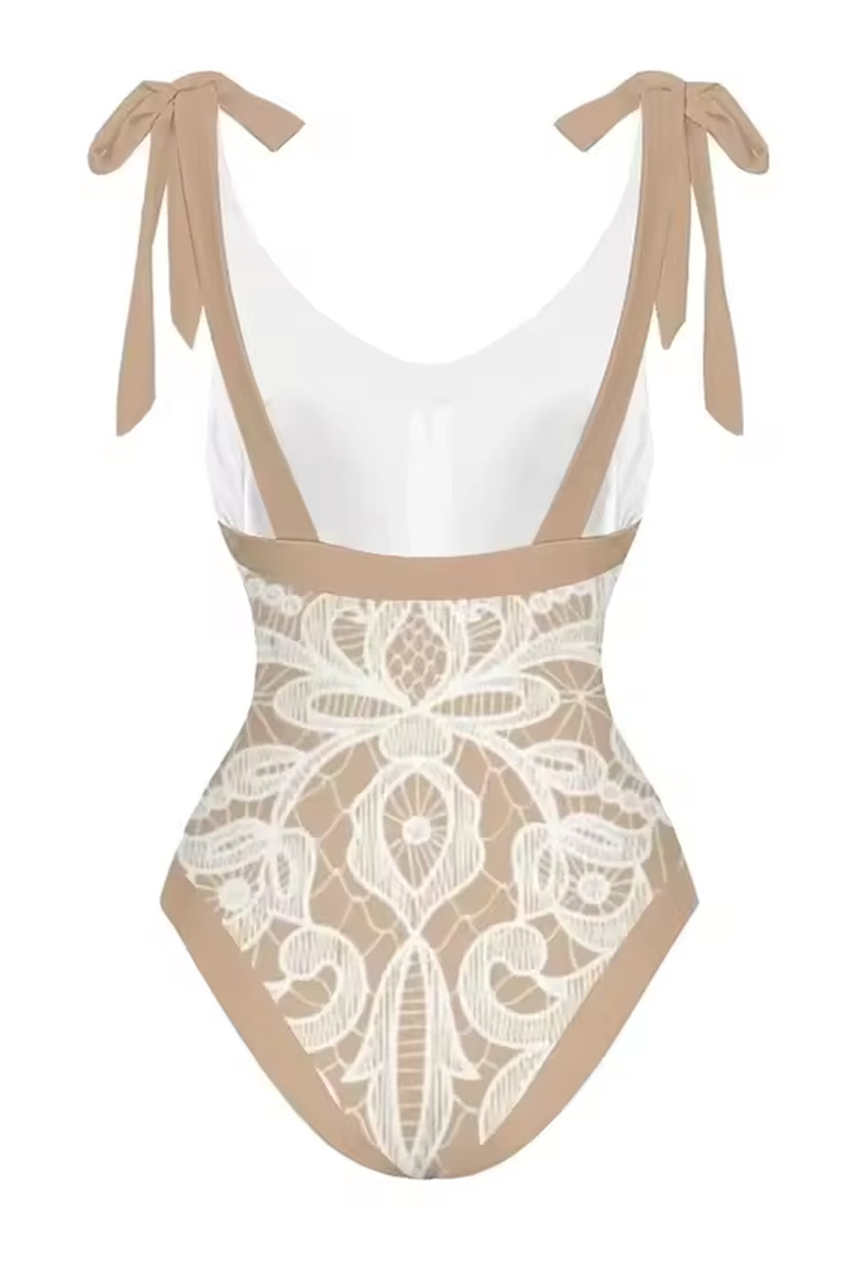 The perfect balance between elegance and natural grace, the Isalene one-piece swimsuit impresses with its nude base and intricate lace print. Bows on the shoulders add a romantic touch. The swimsuit features padded bust for comfort and support.