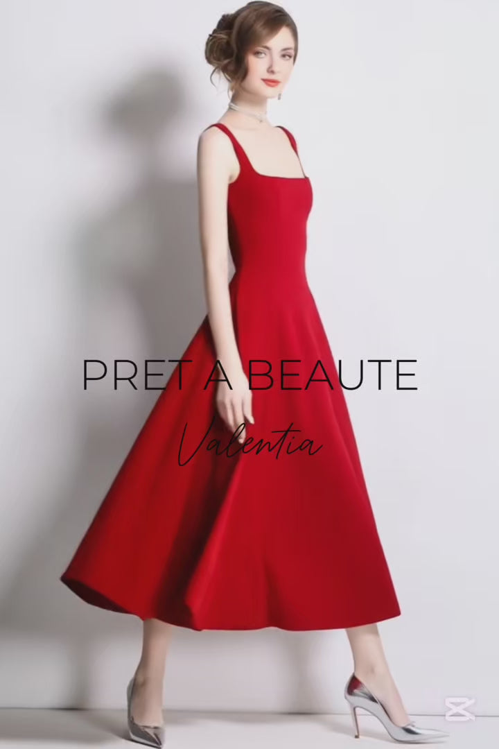 Το φόρεμα Valentia εκφράζει τη διαχρονική κομψότητα μέσα από καθαρές γραμμές και έντονο χρώμα. Σε midi μήκος, με τετράγωνο ντεκολτέ και φαρδιές τιράντες, αναδεικνύει τη σιλουέτα με εκλεπτυσμένη απλότητα. Κλείνει με διακριτό φερμουάρ στο πίσω μέρος, ενώ η φούστα ανοίγει σε ρευστή, κολακευτική γραμμή που χαρίζει άψογη κίνηση σε κάθε σας βήμα.