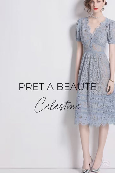 Αναδείξτε τη διακριτική γοητεία της δαντέλας με το φόρεμα Celestine. Φτιαγμένο από εκλεπτυσμένη δαντέλα σε απαλή μπλε γκρι απόχρωση, αγκαλιάζει το σώμα με εφαρμοστό μπούστο και ανοίγει διακριτικά σε αέρινη γραμμή κάτω από τη μέση. Οι λεπτομέρειες με κουμπιά και το βαθύ V εμπρός και πίσω προσθέτουν μία αίσθηση διακριτικής κομψότητας.