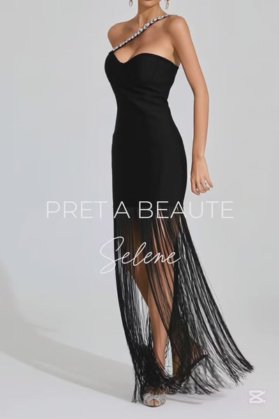 Το φόρεμα Selene ξεχωρίζει για το μοντέρνο σχέδιό του. Αυτό το εκθαμβωτικό κομμάτι διαθέτει μία διαγώνια τιράντα, εφαρμοστό μπούστο και κρόσσια που φτάνουν μέχρι το πάτωμα. Η εφαρμοστή bandage γραμμή του αγκαλιάζει τη σιλουέτα και το μάξι τελείωμα με τα κινούμενα κρόσσια δημιουργεί αίσθηση κομψότητας και κίνησης.