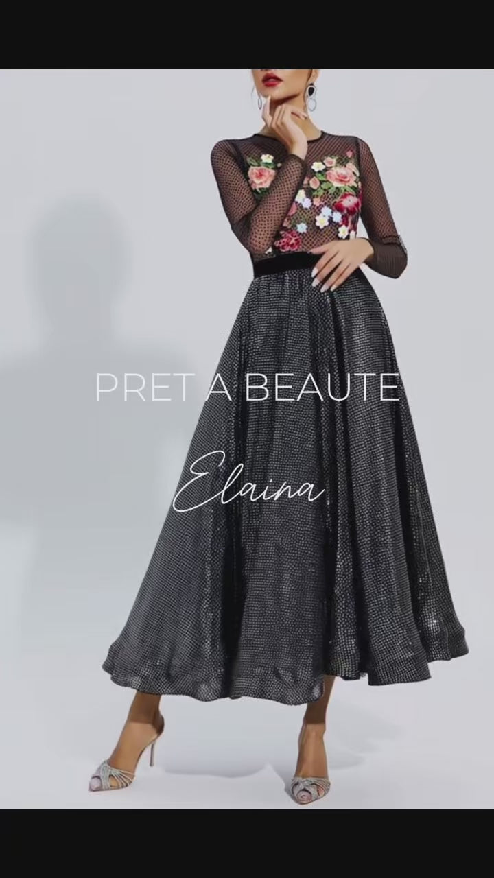 Εντυπωσιακό, βραδινό φόρεμα σε μαύρο, ασημί χρώμα με εντυπωσιακά κεντήματα. Το φόρεμα Elaina έχει δυναμικό στιλ, με μπούστο που φέρει κεντήματα λουλουδιών. Το μπούστο και τα μανίκια φέρουν πουά διαφάνειες. Έχει στρογγυλή λαιμόκοψη και εφαρμόζει με φερμουάρ. Φορέστε το και εντυπωσιάστε. Συμβουλευθείτε τον πίνακα μεγεθών πιο κάτω για σωστή επιλογή μεγέθους.