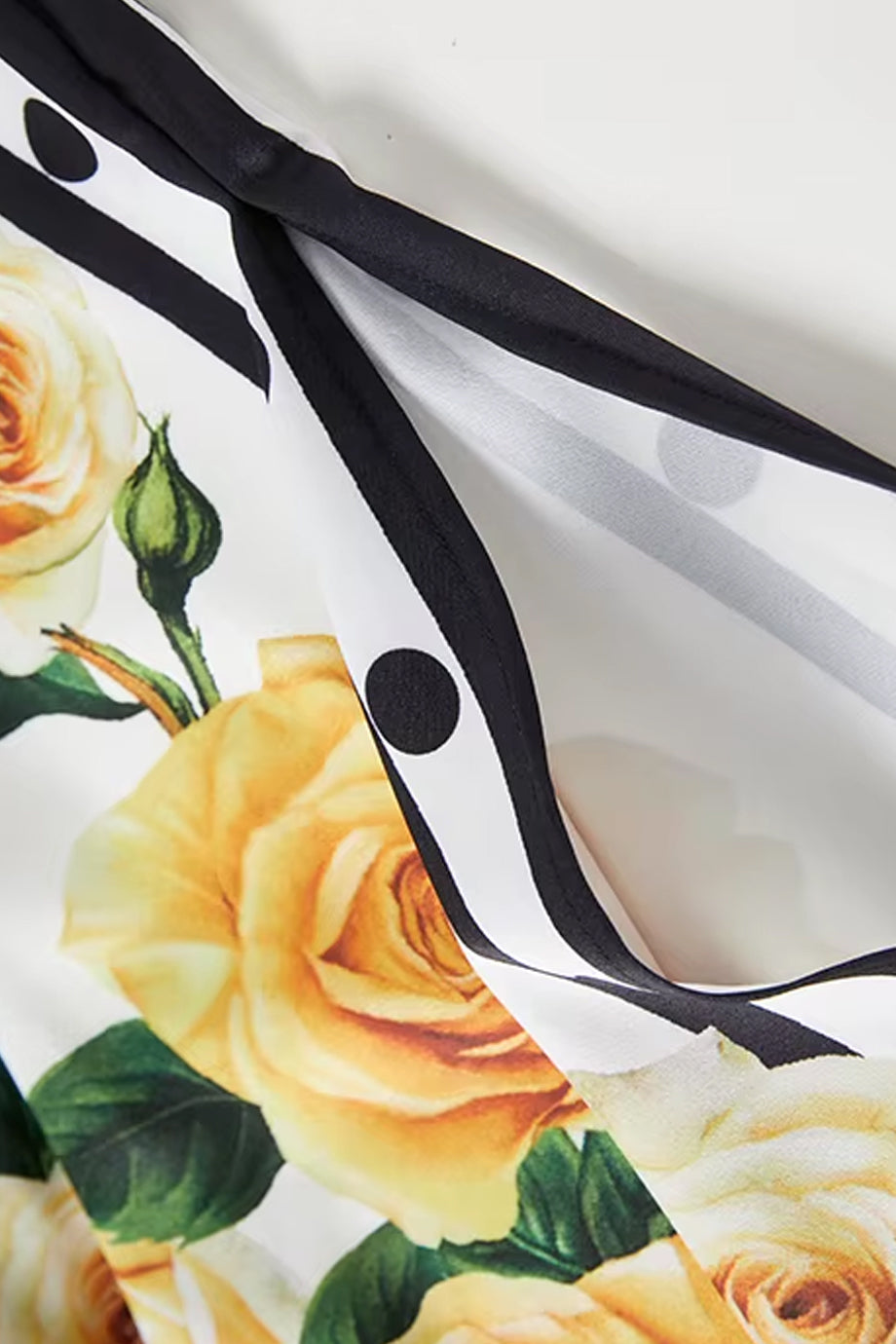 Αναδείξτε τη φωτεινή σας πλευρά με το Amalfi Sun Roses. Το εντυπωσιακό αυτό φόρεμα ξεχωρίζει με το ζωηρό του μοτίβο από κίτρινα τριαντάφυλλα και τις κομψές μαύρες λεπτομέρειες στο ντεκολτέ, τα μανίκια και το τελείωμα. Με αέρινη, χαλαρή γραμμή και μάξι μήκος, αποπνέει τη γοητεία της Μεσογείου — ιδανικό για βόλτες δίπλα στη θάλασσα, καλοκαιρινά brunch ή κομψές εμφανίσεις. Τα φαρδιά μανίκια και τα διακριτικά ανοίγματα στο πλάι προσθέτουν έξτρα κίνηση και στυλ.